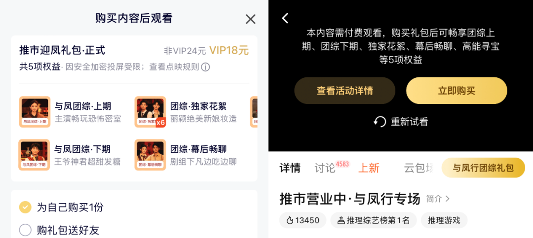 要知道,《推市营业中·与凤行专场》其实是一个VIP会员仍需单片付费的衍生产品,能触达如此热度并不容易。关于这个含有两期团综正片、独家花絮及主创幕后畅聊等素材的「推市迎凤礼包」,腾讯视频VIP还需花费18元购买,非VIP需要24元方可解锁。