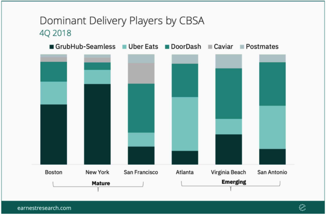 而与之相反,擂主GrubHub在这些地区“稳如泰山”,如纽约2018Q4的市场份额高达71%,平台毛利率一度达到52.26%。