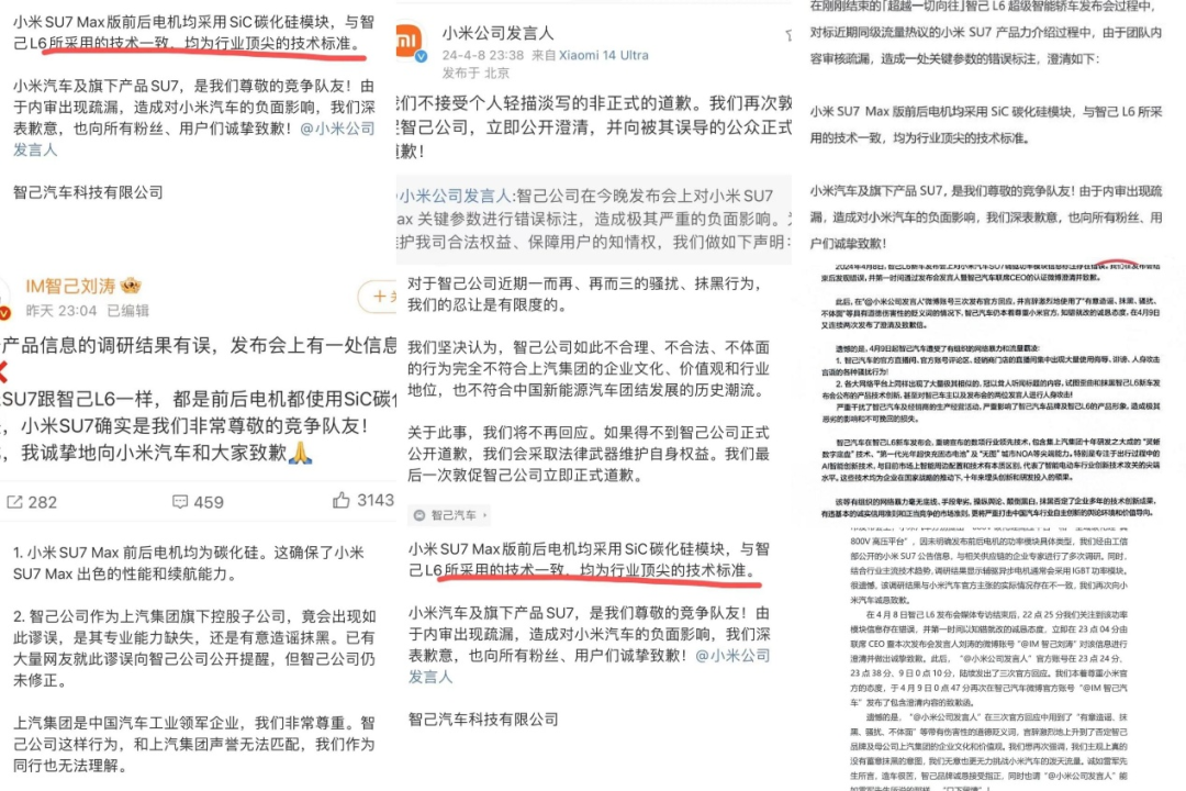 起因是智己发布会上一个书写错误,导致小米要求道歉。智己起先拿公关章发表道歉搪塞,小米不接受,然后创始人微博对数据错误致歉,同时官方公章下场发道歉函。