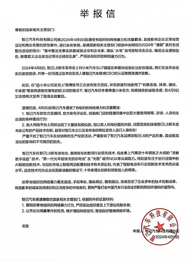 4月11号,智己方面正式向有关部门举报,称遭到侮辱诽谤攻击,抹黑技术创新,影响生产经营。