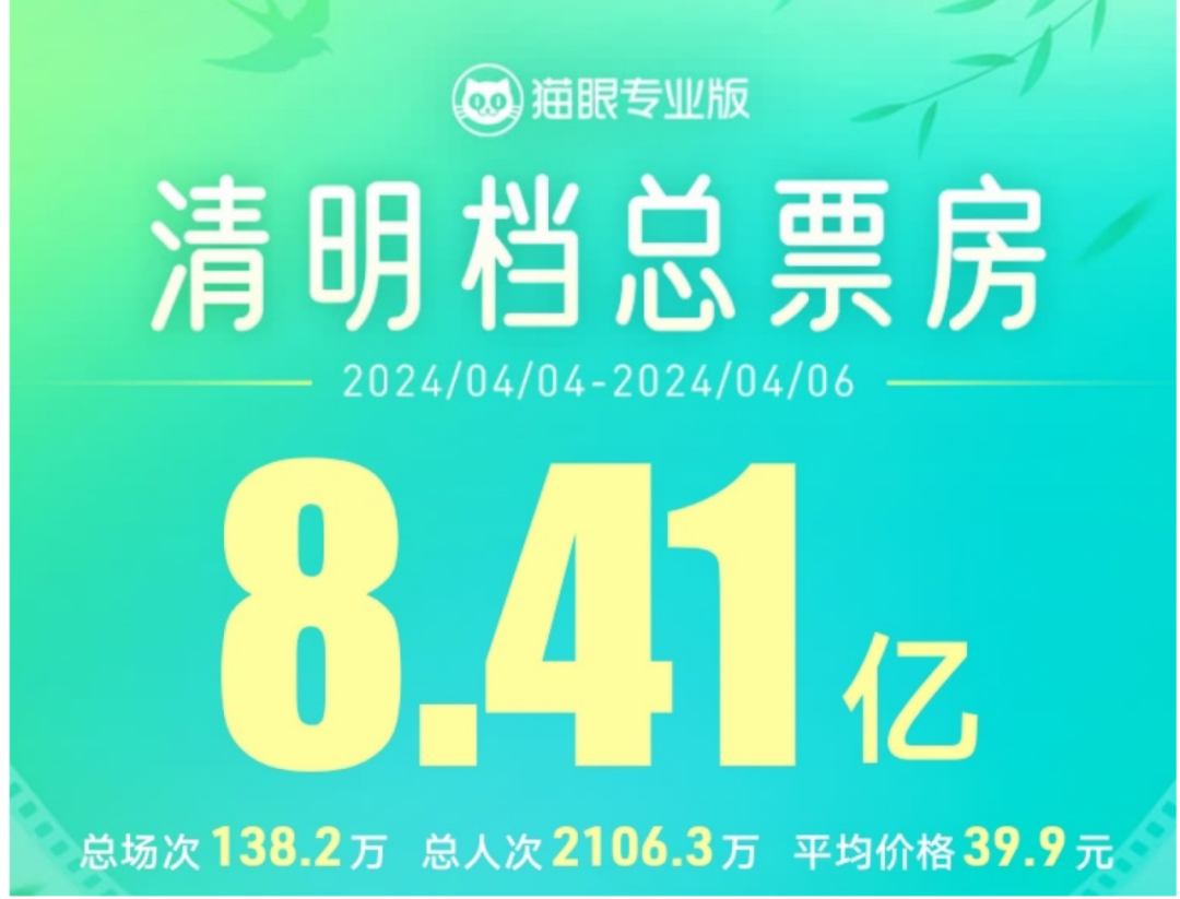 据猫眼专业版数据,2024年清明档(4月4日—4月6日)总票房8.41亿,超2021年清明档票房成绩,刷新中国影史清明档票房纪录。