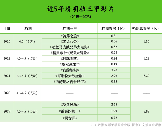 2023年清明档,与《铃芽之旅》同档竞争的还有进口大IP动画电影《超级马里欧兄弟大电影》《名侦探柯南:贝克街的亡灵》,其中《超级马里欧兄弟大电影》拿下了档期季军;时间再往前推,2022年的清明档“档冠”也是一部进口动画电影《精灵旅社4:变身大冒险》。