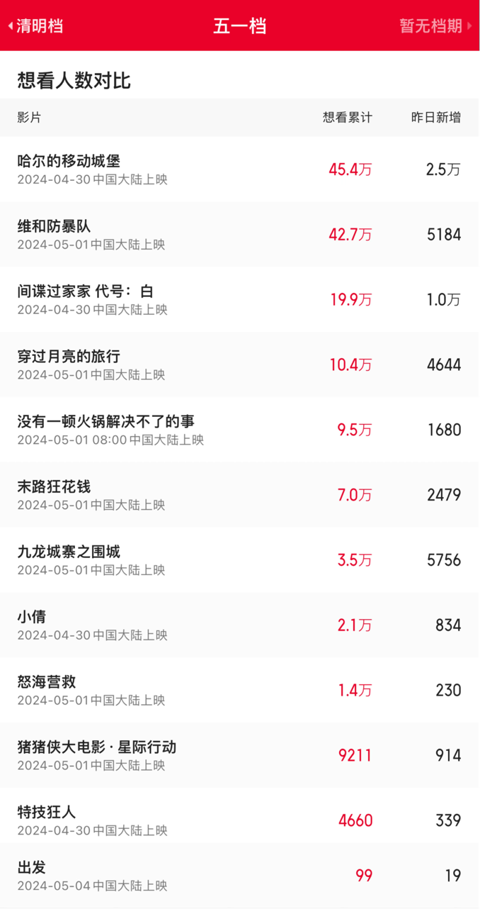 据猫眼专业版数据,截至发稿前,共有12部影片定档2024年五一档,其中9部国产片、3部引进片,而猫眼想看人数最多的也一部宫崎骏动画电影《哈尔的移动城堡》。