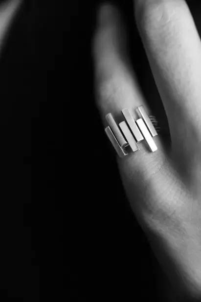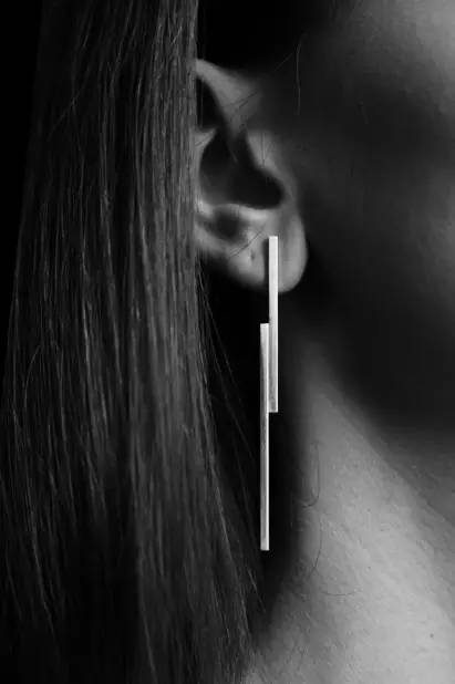 她认为流水别墅是水平或倾斜穿插推移的空间手法,交错融合的稀世之作,于是为了向大师致敬,她设计出了这样一系列建筑首饰,可以随意穿插改变造型,让你极简的首饰也魔幻起来。