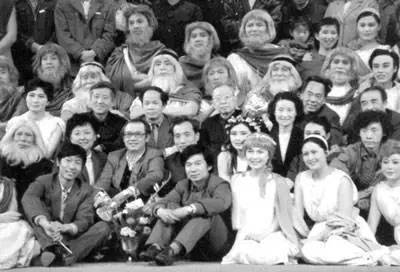△1986年罗念生(中间怀抱鲜花者)与中央戏剧学院《俄狄浦斯王》剧组合影