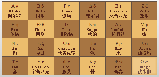 △现在的希腊字母,共24个,而古代希腊语中原有26个字母。看到前四个突然想起高中数学老师东北口味儿的读音了,嗤。