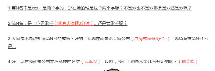 不知道有多少人痛恨这几句话,在前几季里,这个环节一般会持续20-30分钟,而在最新一季节目里,这个环节非但没有删减,反而有变本加厉的趋势。不可否认,这个“卖关子”的环节在第一季初期的时候给人眼前一亮的感觉,可是在这个梗被玩烂了之后,就变成了一条十足的鸡肋。
