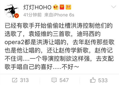 其实洪涛控制欲太强已不是什么稀奇事,去年就网上就爆出了“洪涛霸气怒胁女歌手,紫棋隐忍礼复男导演”的猛料。
