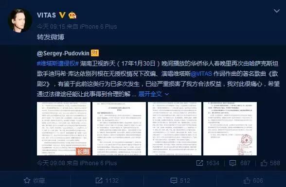 前不久,《歌剧2》原唱维塔斯的制作人布多夫金通过微博对湖南卫视多次侵权的行为表示谴责,并附上了律师函。维塔斯本人也在第一时间进行了转发。