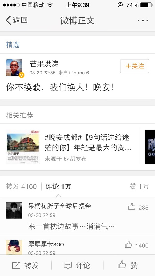 3月30日晚,洪涛毫无征兆地发了一条微博——“你不换歌,我们换人!晚安!”隔空喊话,言语中充满了威胁的颜色。