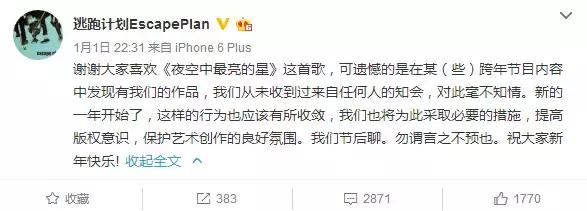 这让滚君想到了另一件事,今年的1月1号,逃跑计划“和蔼”地发了条谴责侵权的微博。原来今年跨年,北京卫视的张杰,湖南卫视的邓紫棋都在不打招呼的情况下,翻唱了《夜空中最亮的星》。