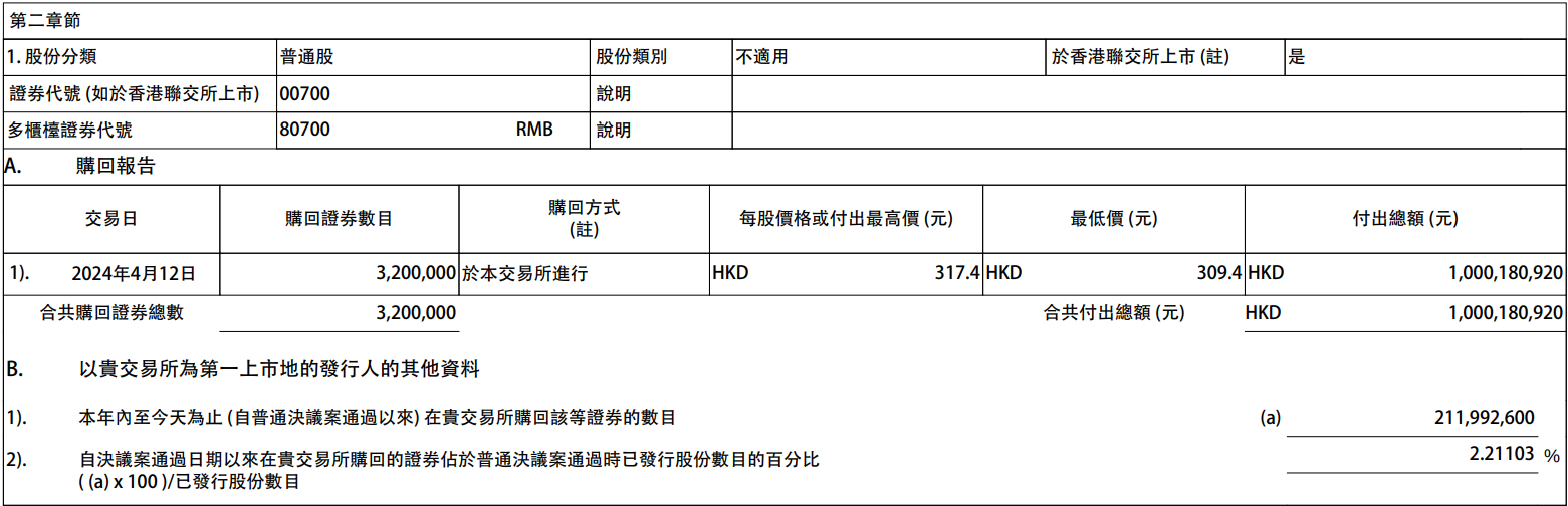 腾讯控股于4月12日在港交所公告,今日以10亿港元回购320万股公司股份,每股回购价309.4港元-317.4港元。