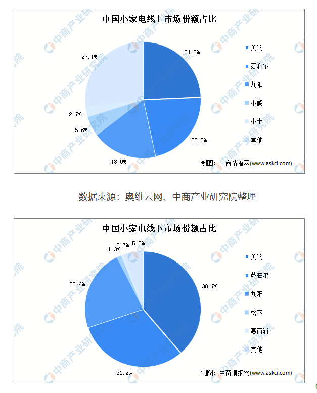 据“中商情报网”2022年数据显示,小家电市场呈现美的、苏泊尔、九阳股份三足鼎立的局面。具体看,在中国小家电线上市场份额中,上述三家合计占比64.6%,小熊电器占比仅为5.6%,排名第四;而在线下市场份额排名名单中,并未看到小熊电器的身影。