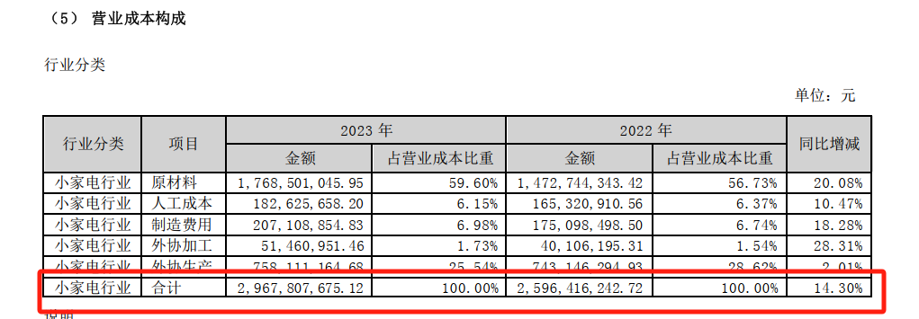 此外,小熊电器壶类厨房小家电毛利率下滑1.31%,生活小家电毛利率下滑0.62%。这背后,公司主营业务的成本增加了14.3%;增长最明显的当属原材料,同比增长20.08%。