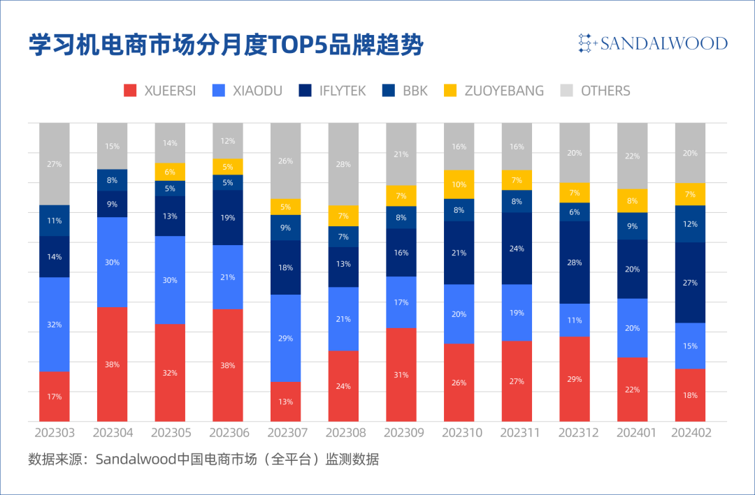 Sandalwood数据显示,自去年下半年以来,小度、科大讯飞两位奉行AI路线的玩家,几乎没有掉出过学习平板月度销量榜单TOP3。某学习机经销商经销商也曾告诉光子星球,在其门店,搭载有大模型的旗舰产品,销量甚至高于打折的老款学习机。