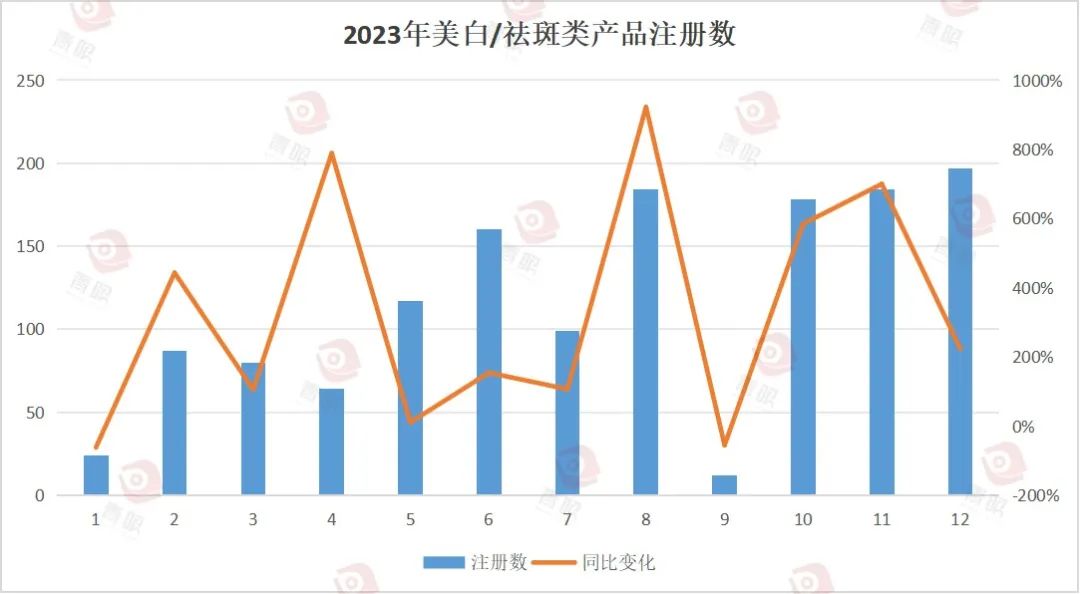 因此,随着各大企业开始将政策落地,美白产品的注册量又开始呈现爆发式增长。青眼情报数据显示,2023年美白祛斑类产品注册量为1386件,同比增长约178%,注册量几乎回到了2021年的水平。其中,8月甚至同比增长922%。