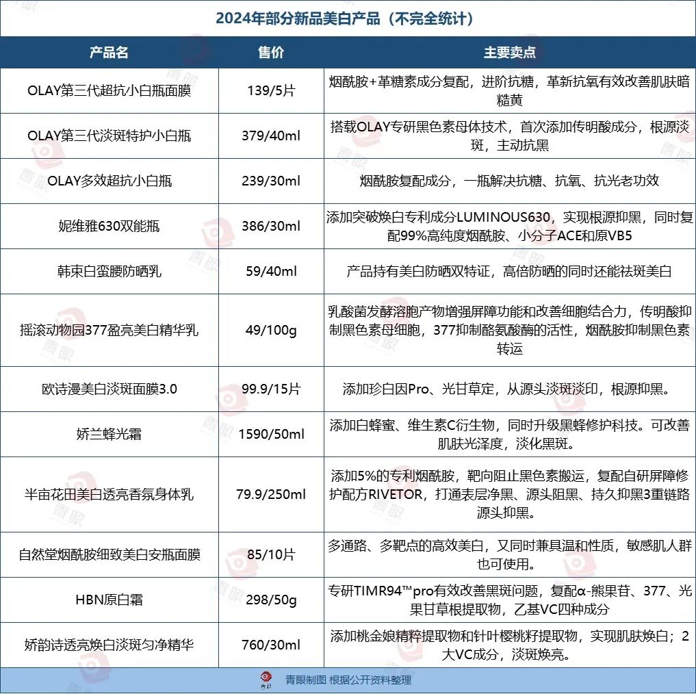 今年以来,包括OLAY、妮维雅、娇兰、娇韵诗、韩束、欧诗漫、HBN等品牌均推出了美白新品,价格从几十元到上千元不等,涉及平价至高端产品线,囊括了水乳、霜膏、面膜、防晒、身体乳等多种品类。可以说,市场可谓是相当活跃。