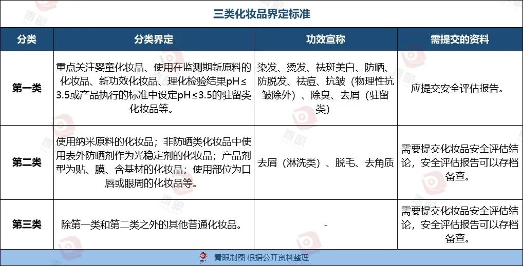 根据《提交指南》,功效宣称为“染发、烫发、祛斑美白、防晒、防脱发、祛痘、抗皱(物理性抗皱除外)、除臭、去屑(驻留类)”的化妆品,被划分至第一类化妆品中,需要提交完整安全评估报告。