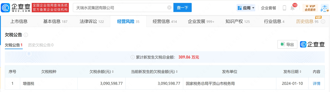 企查查显示,天瑞水泥今年1月已经出现了欠税的情况。