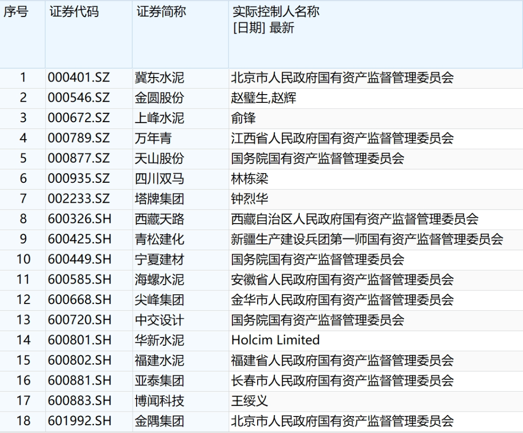 Wind数据显示,A股水泥板块共有18家上市公司,港股除去天瑞水泥外,共有8家上市公司。去重后的累计23家公司中,有14家的实控人都能追溯到各省市国资委,还有像华新水泥(600801.SH)这样,曾是黄石国资实控,现在控股股东为外资企业,国资仍保留一定话语权的企业。