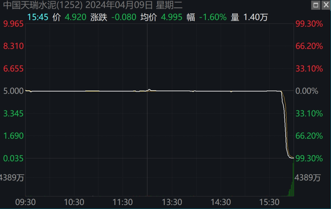 4月9日下午,港股市场上出现神奇一幕。距离收盘仅剩15分钟时,中国天瑞水泥(1252.HK)的股价突然闪崩,单日跌幅高达99.04%,直接从前一天的5港元/股跌至0.048港元/股。