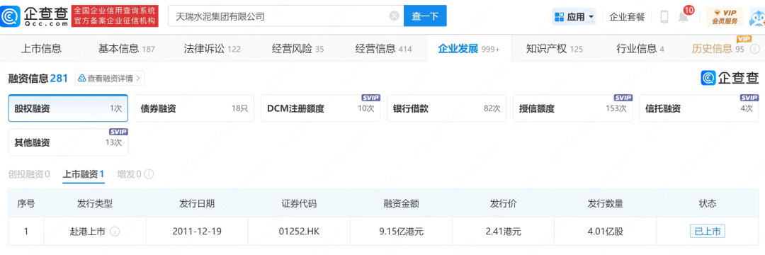 企查查中,天瑞水泥融资信息有281条,包括1次股权融资、18只债券融资、10次DCM注册额度(以特定资产组合或特定现金流为支持,发行可交易证券的一种融资形式)、82次银行借款、153次授信额度、4次信托融资以及13次其他融资。