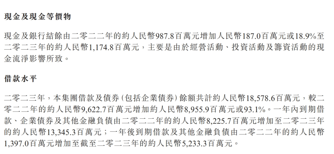 而负债表的几项指标,更是让不少投资者感到“不安”。比如借款及债券余额共计185.79亿元,同比增加93.1%;其中一年内到期的借款、企业债券及其他金融负债从2022年的82.26亿元飙升2023年的133.45亿元;一年后到期的借款及其他金融负债从2022年的13.97亿元飙升至2023年的52.33亿元。