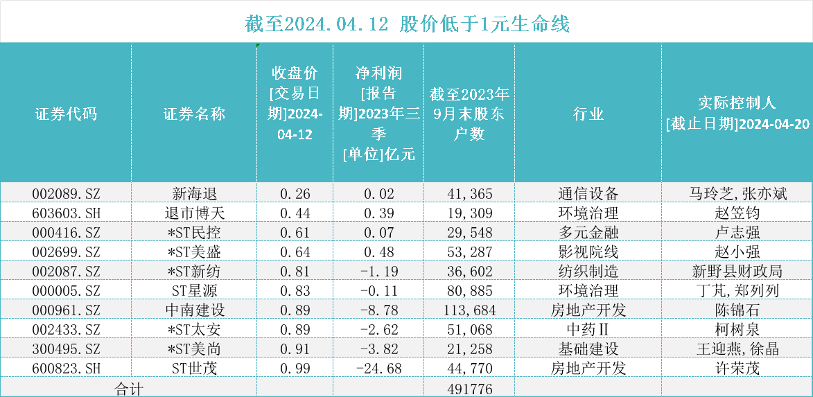 根据界面新闻统计,截至4月12日已有10家上市公司股价低于1元生命线,根据沪深交易所有关规定,连续20个交易日的每日股票收盘价均低于1元,交易所决定终止其股票上市;北交所则规定,上市公司连续60个交易日股票每日收盘价均低于每股面值,交易所决定终止其股票上市。截至2023年9月末10家上市公司的股东户数高达49万户。