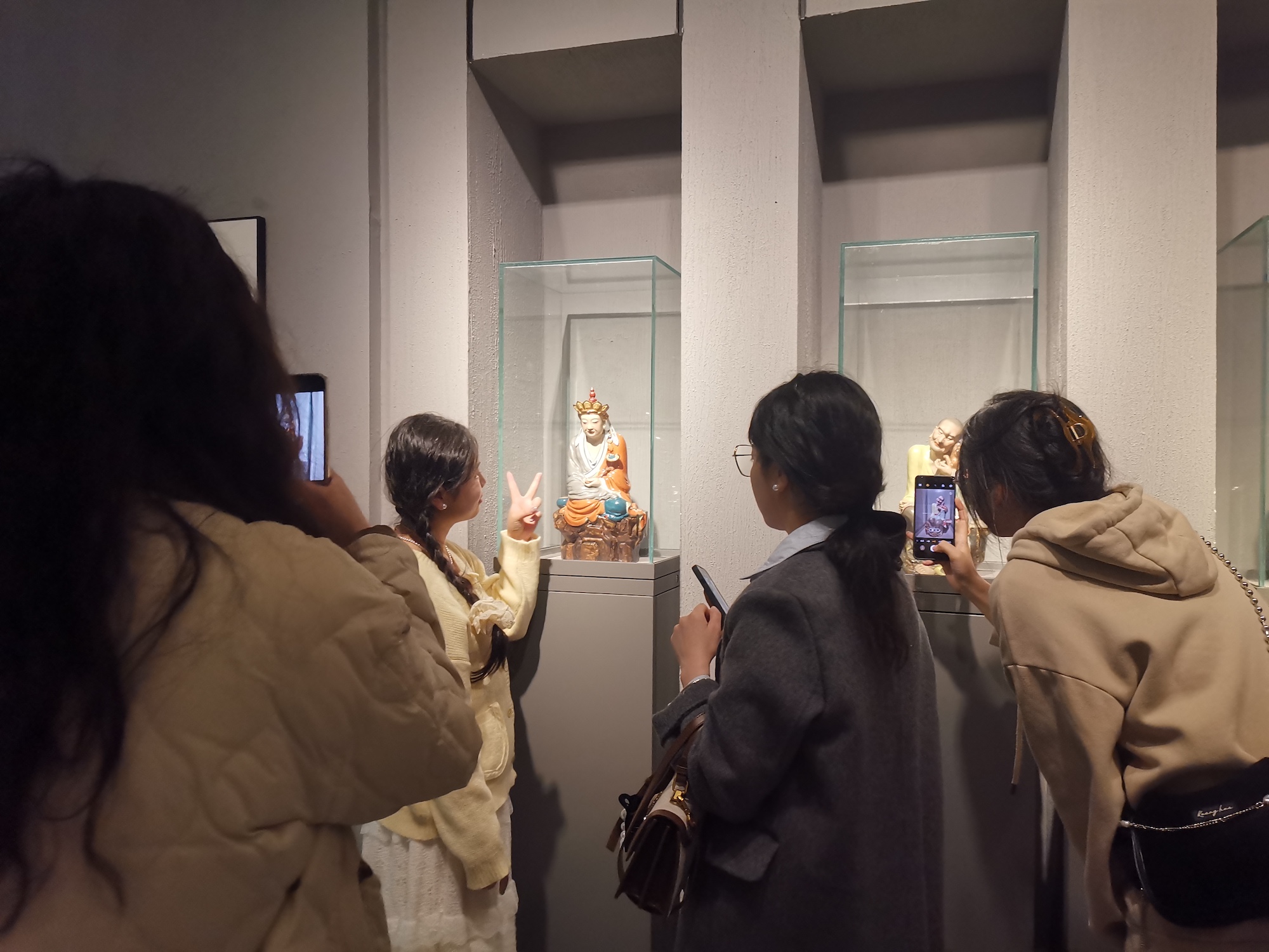 大部分游客到景德镇的第一站,往往是中国陶瓷博物馆。这里的“无语菩萨”展位前经常排起长龙,年轻人挨个拍照留念,上传社交媒体,哈哈笑着转身离去,十几秒内一气呵成。