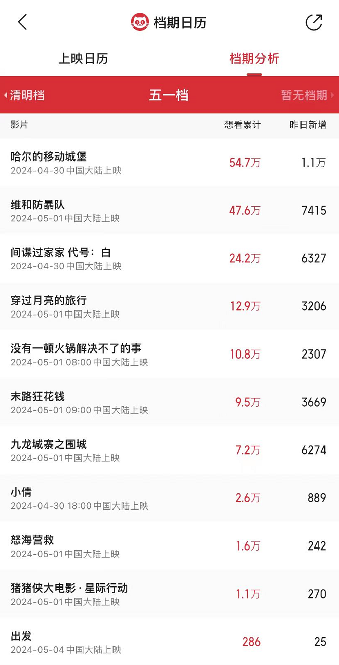 此外,根据猫眼专业版数据,在接下来的五一档,宫崎骏的《哈尔的移动城堡》是目前想看人数最多的影片,同为引进片的《间谍过家家代号:白》想看人数也达到24.2万。由此可以推测,在即将到来的五一档,引进片还将持续发力,而在之后,储备中的安妮海瑟薇新片《母亲的直觉》,以及去年戛纳电影节上的口碑之作《枯叶》等,也有望拿到不俗的表现。