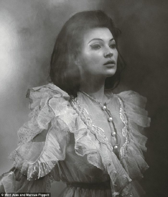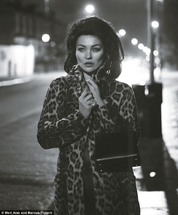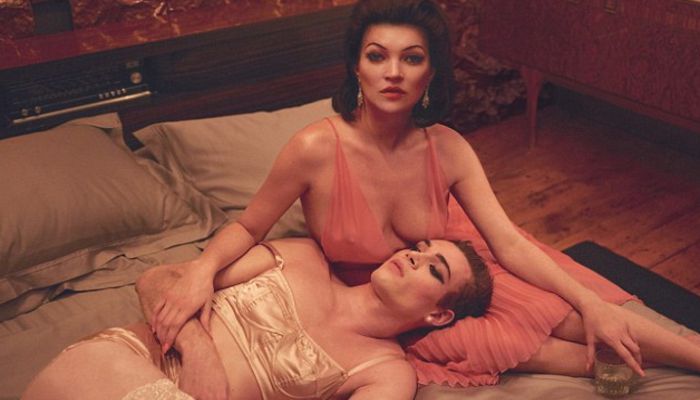照片中的摩丝身穿珊瑚色长裙并且与另一位身着吊带紧身胸衣的模特卢卡·埃塞克坐在一起,已经是一个孩子母亲的摩丝承认身为青少年的自己在刚刚进入时尚界的时候进行了很大的心态调整。