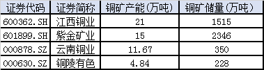 界面新闻将目前A股中具有铜矿资源的主要的4家上市公司进行了梳理,具体铜矿储量及产能如下表所示: