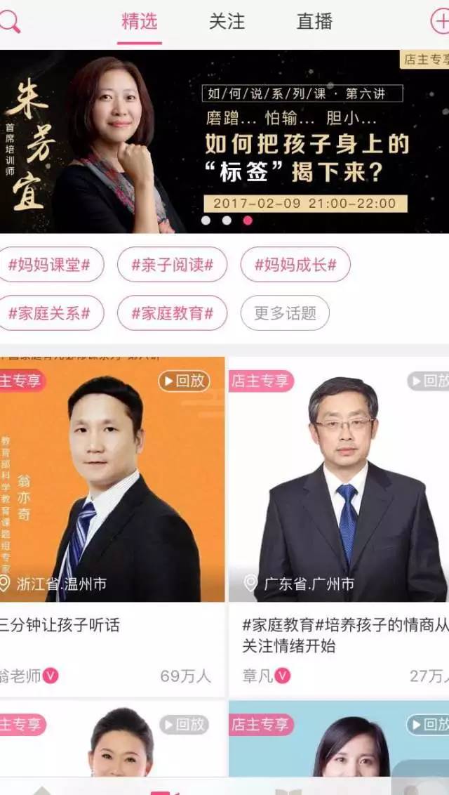 吴方华进一步说道,现在很多作者都愿意把书放到大V店的平台上卖,因为相比于其他电商,大V店不只是一个平台,同时还会帮助作者进行运营、宣传推广。尹建莉、杨红樱、杨澜、以及去年获得安徒生大奖的曹文轩等教育领域的专家,基本上都在大V店平台上或直播、或讲过课。目前,大V店亲子教育领域专家的数量、听课人数都是行业第一。