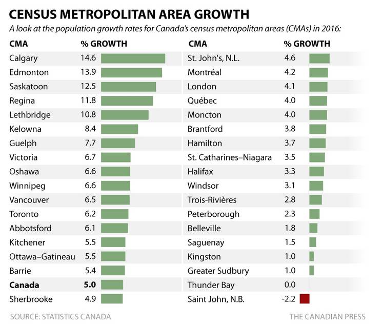 从全国来看,加西人口增长迅速,加东大西洋省份增长缓慢。各省方面,阿省人口增长幅度最大,达11.6%;其次是萨省,达6.3%;第三名为曼省,达5.8%。而人口增长最少的为新省,是负增长,5年间少了0.5%。