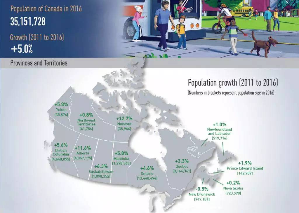 全国有82%的人口都居住在大型和中等城市,该比例也在G7国家中名列前茅。这点与移民人口较多脱不了干系,因为移民倾向于定居于大中型城市定居。在过去五年中,加拿大2/3的人口增长可归因于移民的增加,而只有1/3是自然增长的结果。