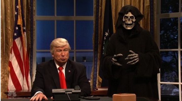 在最近一期美国娱乐节目《周六夜现场》(Saturday Night Live)中,喜剧演员鲍德温(Alec Baldwin)扮演的美国总统特朗普在给各国领导人打电话,他身后站着一位黑衣“魔鬼”给他出谋划策。节目末了,魔鬼对“特朗普”说,我能坐回我的办公桌吗?“特朗普”回答道:当然,总统先生!说完起身把总统的位置让给了魔鬼。