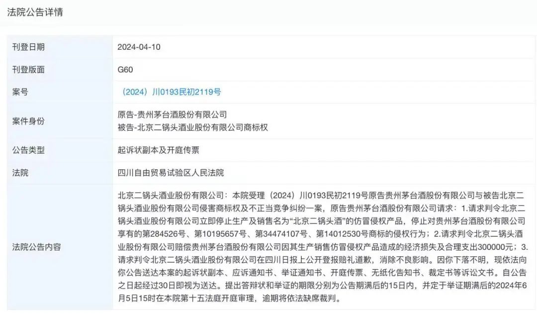 天眼查显示,近日,四川自由贸易试验区人民法院向北京二锅头酒业股份有限公司公告送达贵州茅台酒股份有限公司与该公司侵害商标权及不正当竞争纠纷案件起诉状副本及开庭传票等。