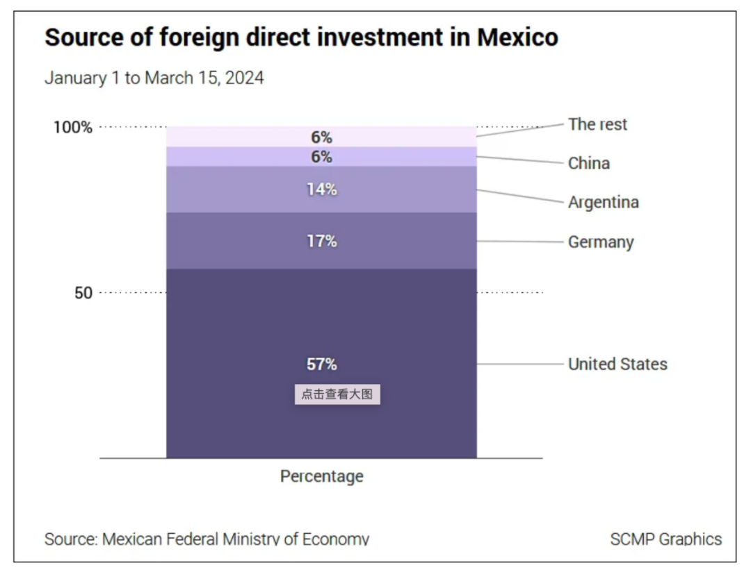 图为“2024年1月1日至3月15日期间,墨西哥FDI来源国占比”。图源:《南华早报》