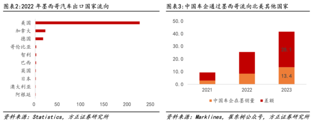 2023年,中国出口到墨西哥的汽车为 41.5 万辆,而中国车企在墨西哥销量13.2万辆,差额为28.3万辆。预估每年大约有68%左右的中国汽车会通过墨西哥,再次出口至北美其他国家。