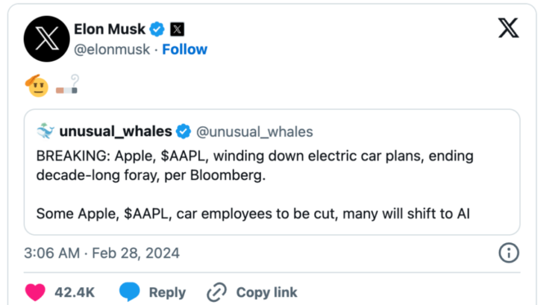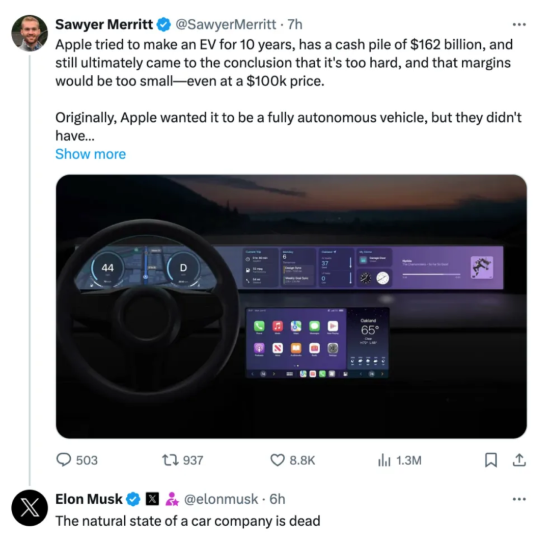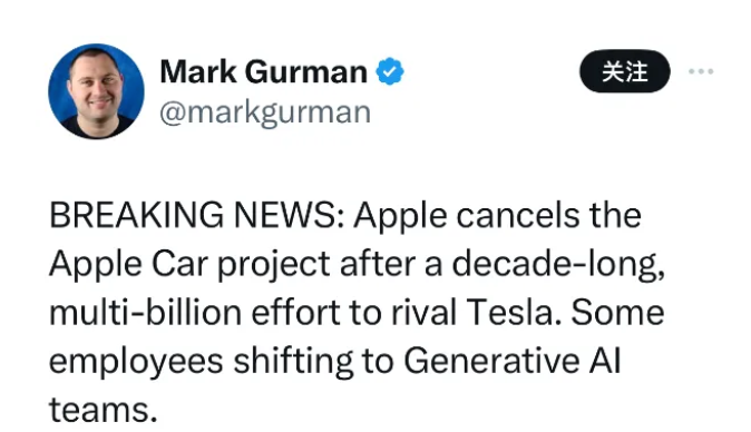 最早爆料苹果放弃造车消息的,是马克·古尔曼。他在X上援引知情人士透露苹果取消了长达10年的电动汽车计划,放弃了该公司历史上最为雄心勃勃的项目之一。