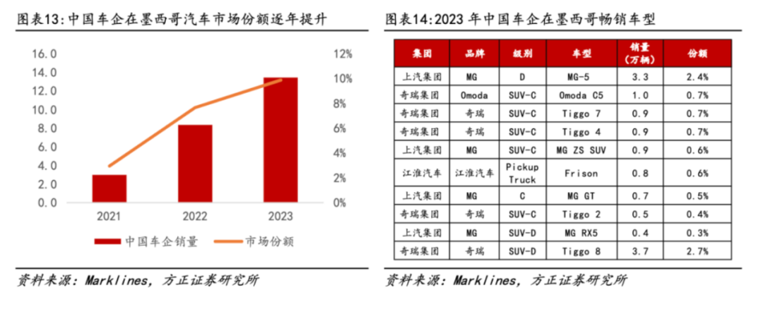 据墨西哥统计局和墨西哥汽车流通企业协会1月24日公布的数据,比亚迪、江淮汽车、吉利等中国汽车品牌,去年在墨西哥的销量为12.9329万辆,同比激增63%;在墨西哥市场占有率达19.5%,较2019年(6.4%)快速增长。而回看方正证券的一份研报,2021年时,中国车企在墨西哥的汽车销量只有3万辆,市场份额仅占3%。