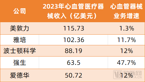 通过收购与资源赋能,强生2023年心血管器械业务营收63.5亿美元,同比增长49.8%。值得一提的是,2023年强生心血管器械业务营收超越爱德华,成长为全球第四大心血管器械巨头。