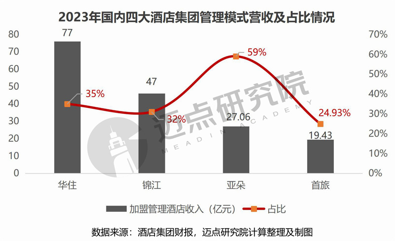 管理加盟情况:当前,国内连锁酒店集团以管理加盟模式为主导,锦江、华住、首旅、亚朵的管理加盟门店占比依次为93.41%、93.45%、89.77%、97%。进一步分析各集团管理加盟及相关服务收入:锦江酒店前期加盟服务收入、持续加盟及劳务派遣收入总计约47亿元,占其总营收的32%;华住集团管理加盟及特许经营酒店营收77亿元,占其总营收的约35%;据首旅酒店财报数据显示,酒店管理模式的收入占比24.93%;亚朵财报数据显示,2023全年其管理酒店收入为27.06亿元,同比增长98.8%,占比约59%。综上,管理加盟收入为上述四大连锁酒店集团营收的重要来源之一,占比约在25%-60%之间。
