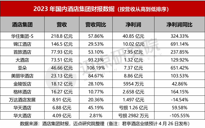 三、2023年国内酒店集团财报营收表现:华住集团领先优势明显,各集团差距拉大,地产系酒店业务营收同比均值达66%