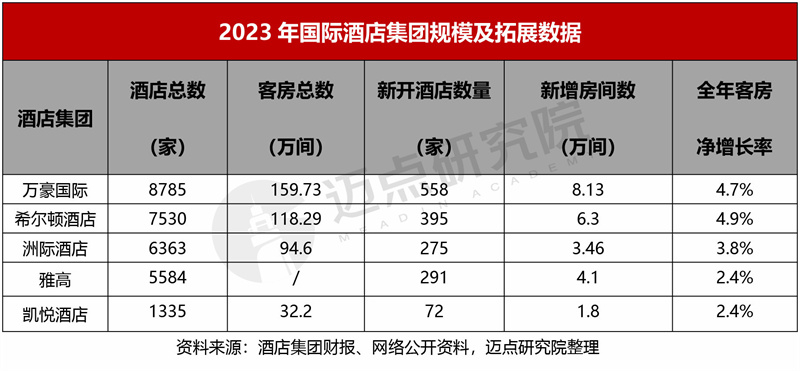 国际酒店集团拓展表现:2023年,各国际酒店集团持续加快全球扩张步伐,新店开业不断、酒店规模持续扩大,如截止2023年底,万豪国际酒店集团在营酒店8785家,酒店客房数约160万间。万豪、希尔顿、洲际、雅高、凯悦这5家酒店集团2023年度新增客房数均超万间,其中万豪、希尔顿这两家酒店集团客房净增长率约达5%。