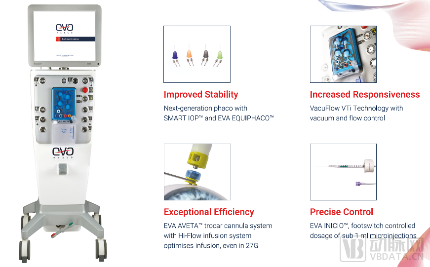 此次被并购的荷兰眼科DORC便深耕于眼科医疗器械领域,并在眼科设备赛道处于全球领先位置——该公司在行业首创了双刃玻切头和EVA外科手术设备,后者最新产品为EVA NEXUS 全新超乳玻切一体机。