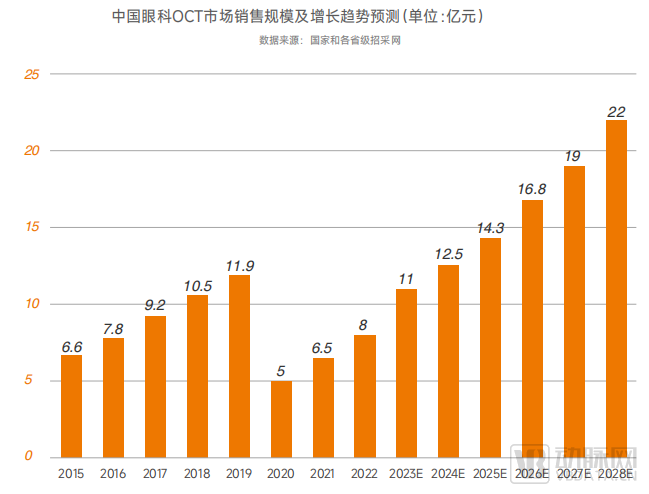 得益于国内眼科OCT产品需求的快速增长,眼科OCT市场销售规模不断扩容。据《2023中高端眼科设备行业白皮书》调研显示,我国眼科OCT市场销售规模从2015年的6.6亿元已增至2023年的11亿元,接近翻一番。