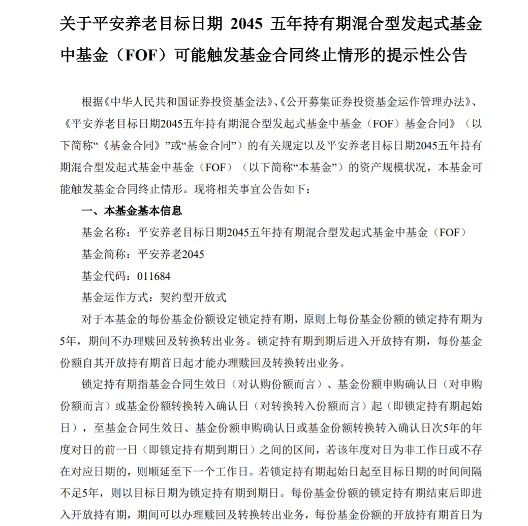 多只发起式养老FOF正面临“三年大考”。今日,平安基金发布公告称,平安养老目标日期2045因为规模不足2亿元,或将在4月20日面临清盘。