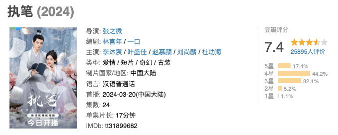 长视频平台所出品独播的10-20分钟/集的精品短剧,其服化道制作水准大都与一般网剧无二,题材往往更大胆前卫,近两年来出圈之作也越来越多。仅在近期,就有根据知乎网文IP改编的《执笔》破圈效应明显,该剧上线两周后分账票房破千万,冲进腾讯视频站内热搜榜第二,豆瓣开分达到7.6,目前在豆瓣已经累积超2万5千人标记,蝉联猫眼等短剧热度榜单;此外,4月以来其他平台播出的微短剧诸如《夫君大人别怕我》《难寻》《爱在天摇地动时》等,也呈现出较高的平均质量。