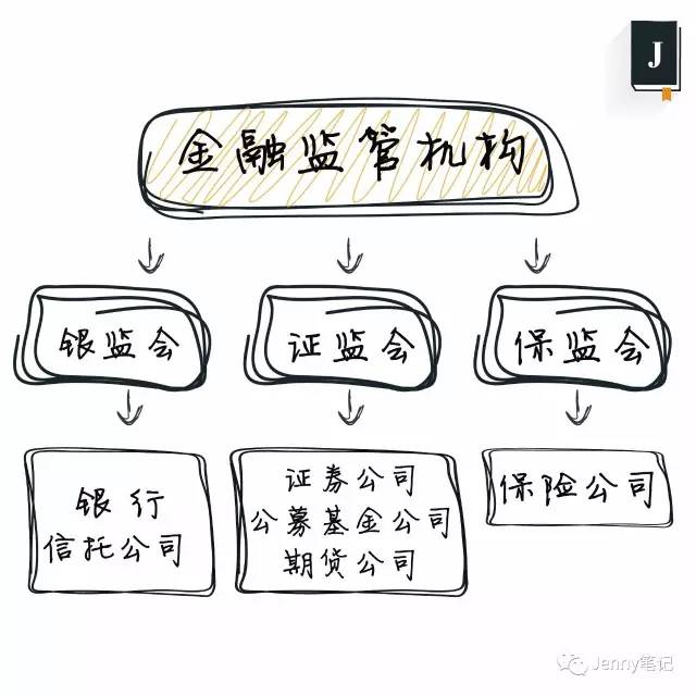 目前国内金融监管机构一共有三个,银监会、证监会和保监会,所以对应来看,银监会下属的金融机构有银行和信托公司,证监会下属的金融机构有证券公司、公募基金公司和期货公司;保监会下属的金融机构有保险公司,具体公司的清单明细,大家可以到各个监管机构的网站上查到获批的具体名单。这边需要提醒的一点是,不是叫某某基金的公司就是证监会下属的公募基金公司,这是完全两个概念,不要混淆。